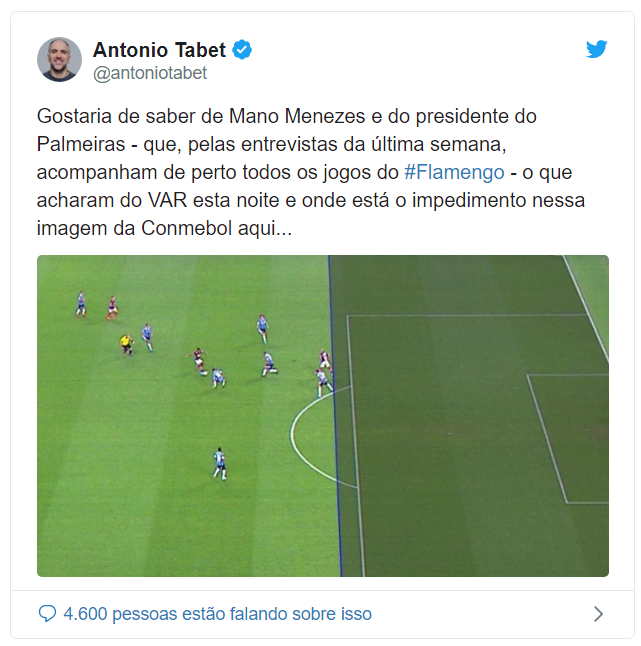 “Gostaria de saber de Mano Menezes e do presidente do Palmeiras – que, pelas entrevistas da última semana, acompanham de perto todos os jogos do Flamengo – o que acharam do VAR esta noite e onde está o impedimento nessa imagem da Conmebol aqui”, escreveu Tabet na legenda da foto que mostra a linha do impedimento que fez o segundo gol do Flamengo ser anulado ainda no primeiro tempo.