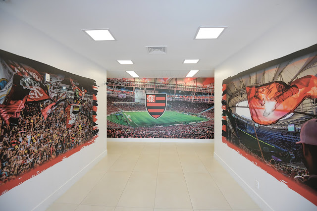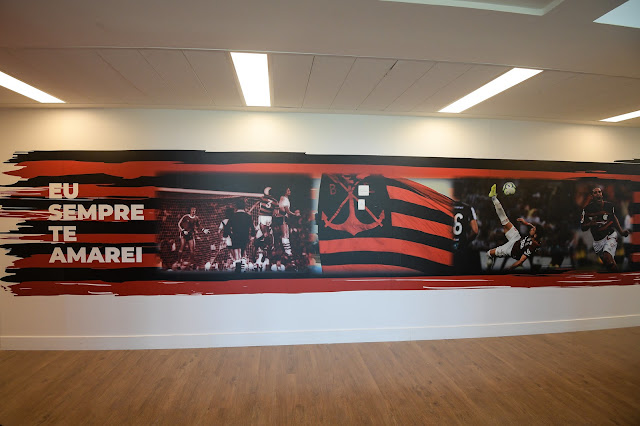 A personalização das paredes do Centro de Treinamento recebeu imagens relacionadas ao clube — em especial, fotos da histórica campanha rubro-negra em 2019 e até a imagem do técnico Jorge Jesus em cima do caminhão de bombeiro.