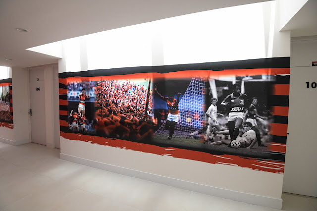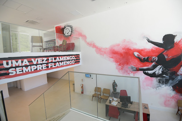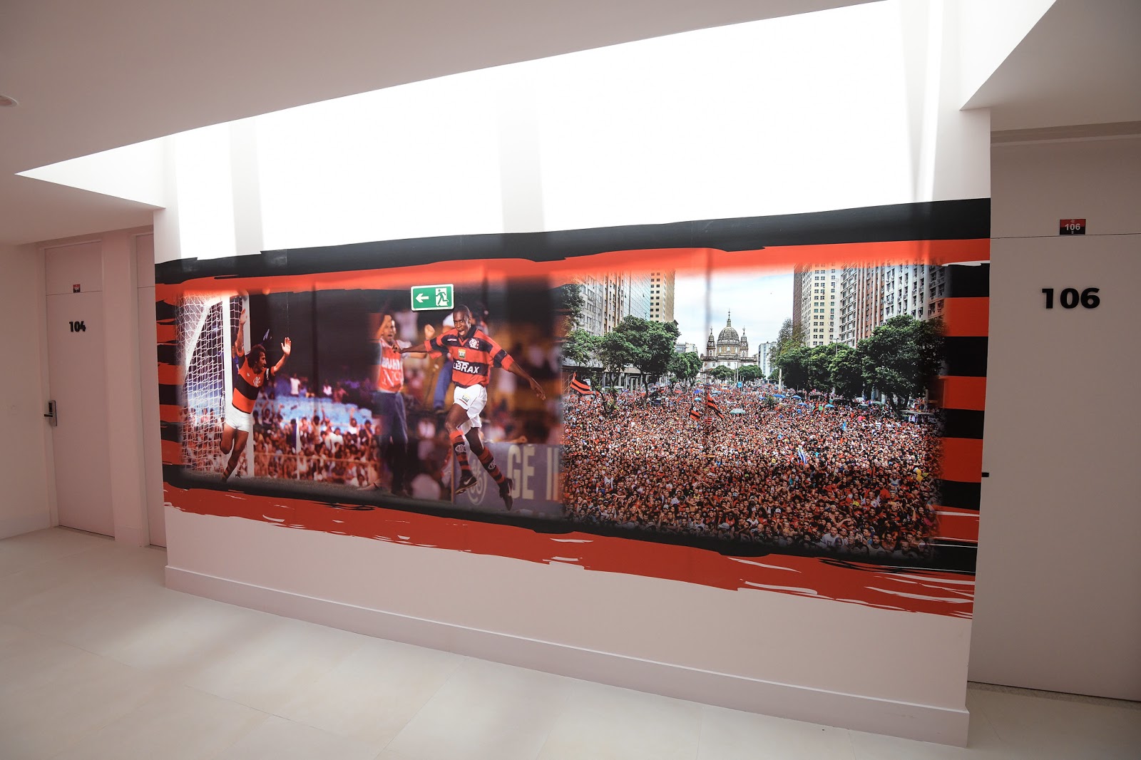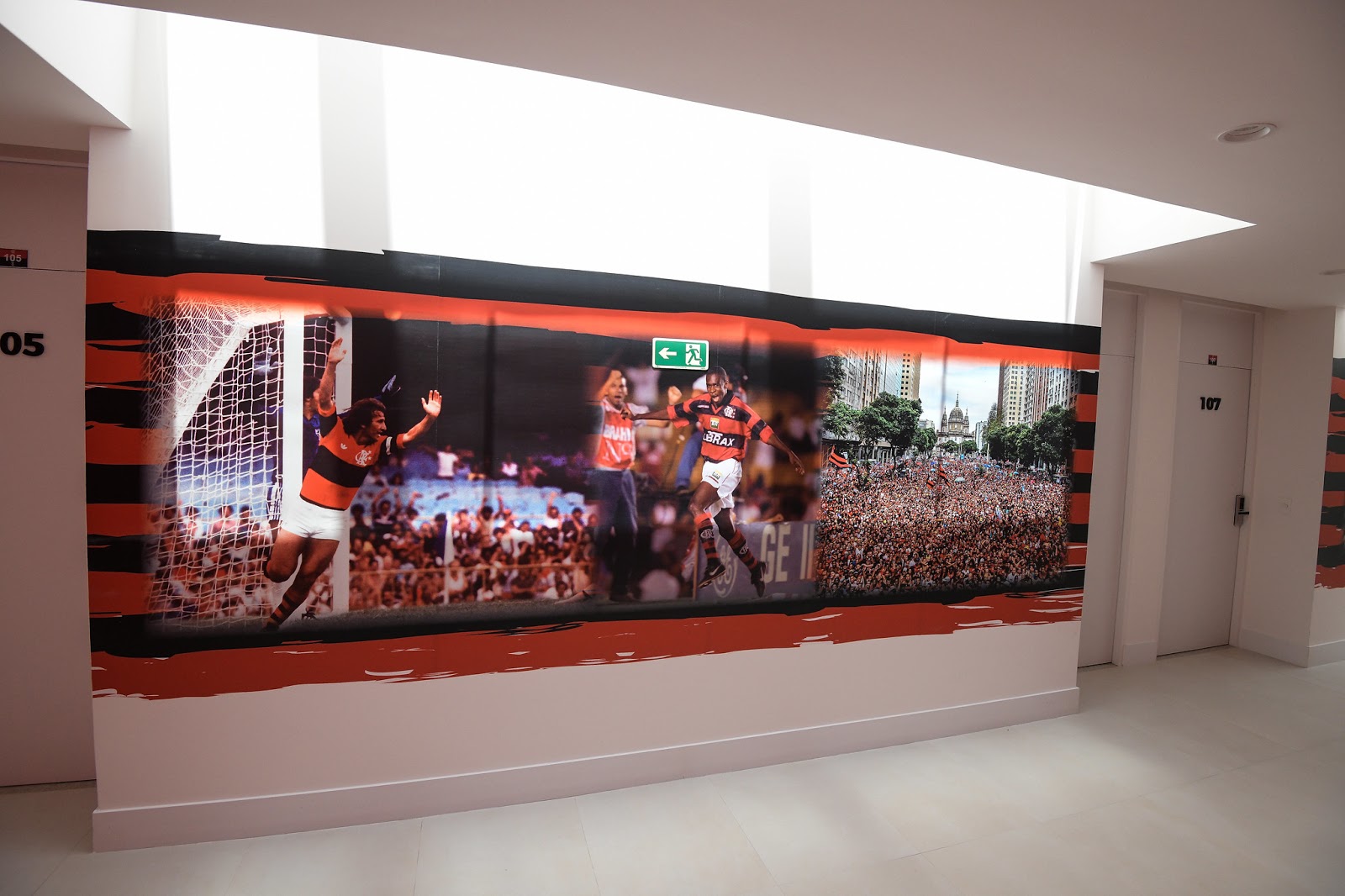 A personalização das paredes do Centro de Treinamento recebeu imagens relacionadas ao clube — em especial, fotos da histórica campanha rubro-negra em 2019 e até a imagem do técnico Jorge Jesus em cima do caminhão de bombeiro.