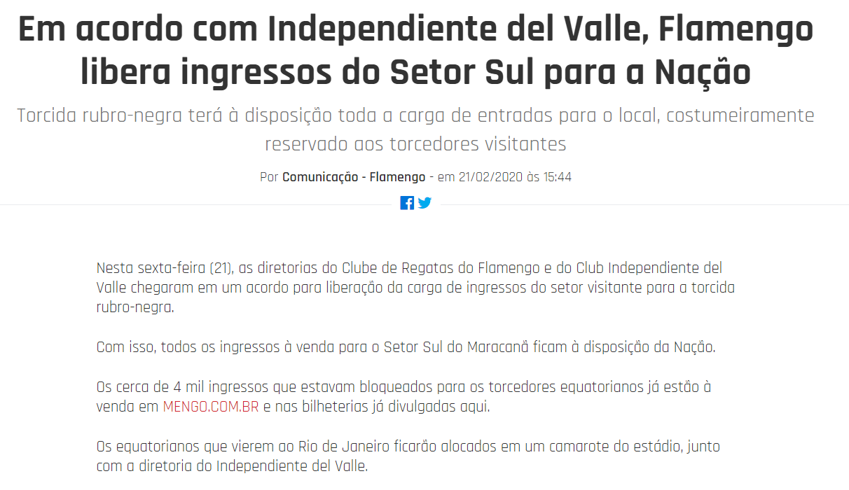 A torcida do Flamengo terá direito a mais 4 mil ingressos para o jogo de volta da Recopa Sul-Americana, na próxima quarta-feira. O clube chegou a um acordo com o Independiente Del Valle para liberar o Setor Sul – geralmente destinado aos visitantes – para os rubro-negros. Vale destacar que tal informação foi confirmada através de uma nota oficial publicada no site do clube (leia a nota completa abaixo).