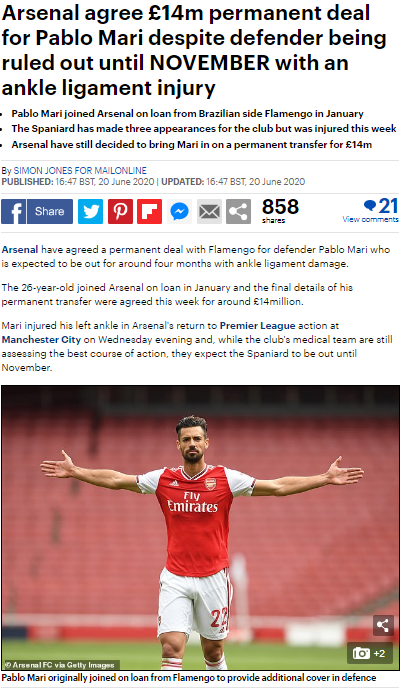 O anúncio vem após o zagueiro lesionar o ligamento do tornozelo durante o jogo contra o Manchester City. No duelo, Marí se lesionou e deu lugar a David Luiz, que falhou em um dos gols, cometeu um pênalti e foi expulso, ocasionando a derrota do Arsenal para o City por 3 a 0.