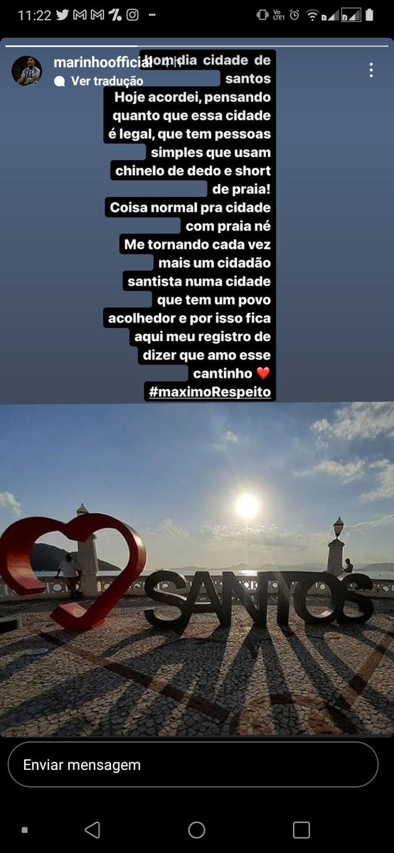 — Bom dia, cidade de Santos. Hoje acordei pensando quanto que essa cidade é legal, que tem pessoas simples que usam chinelo de dedos e shorts de praia! Coisa normal para cidade de praia, né? Me tornando cada vez mais um cidadão santista, numa cidade que tem um povo acolhedor. Por isso fica aqui meu registro de dizer que amo esse cantinho, escreveu Marinho, com a hashtag “máximoRespeito”.