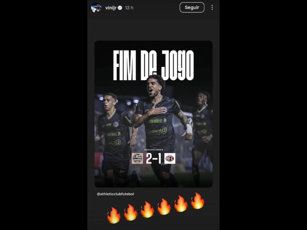 Pelas redes sociais, Vini repostou nos stories do Instagram a publicação oficial da equipe, celebrando o triunfo, e adicionou emojis de fogo em apoio.