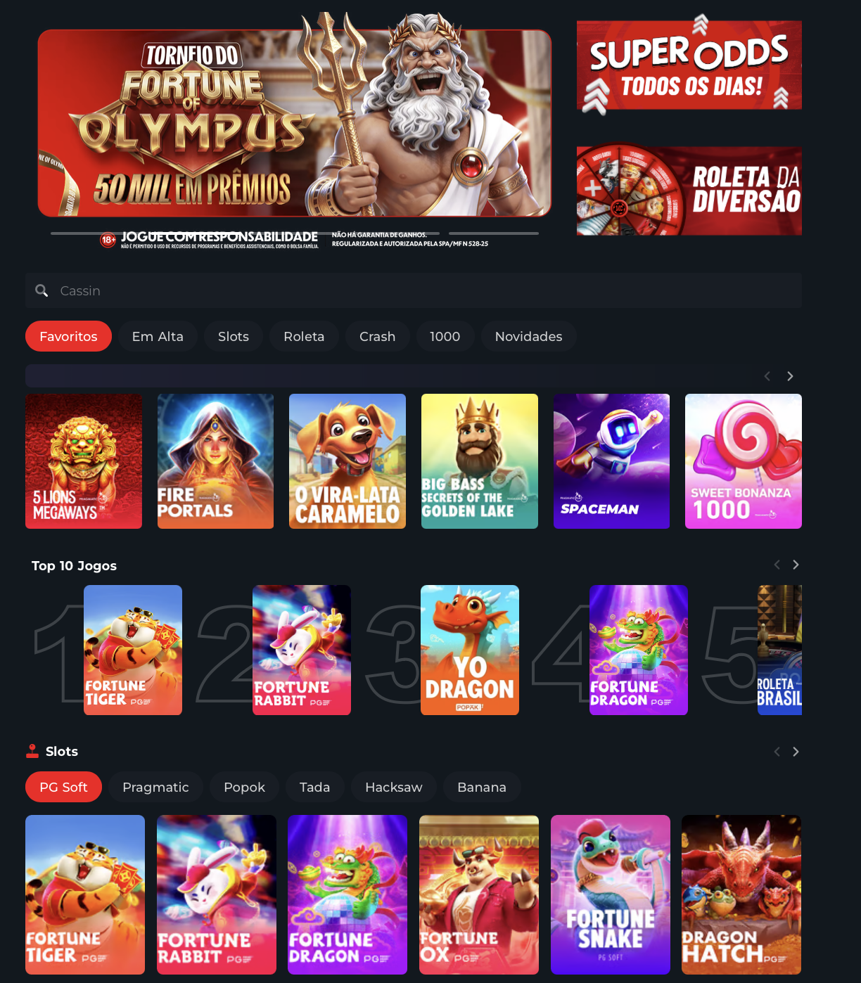 • Carrosséis Inteligentes de Jogos: A home agora apresenta linhas horizontais de jogos em destaque, separados por categorias como Favoritos, Em Alta, Slots, Roleta e Crash, permitindo navegação mais organizada e moderna.